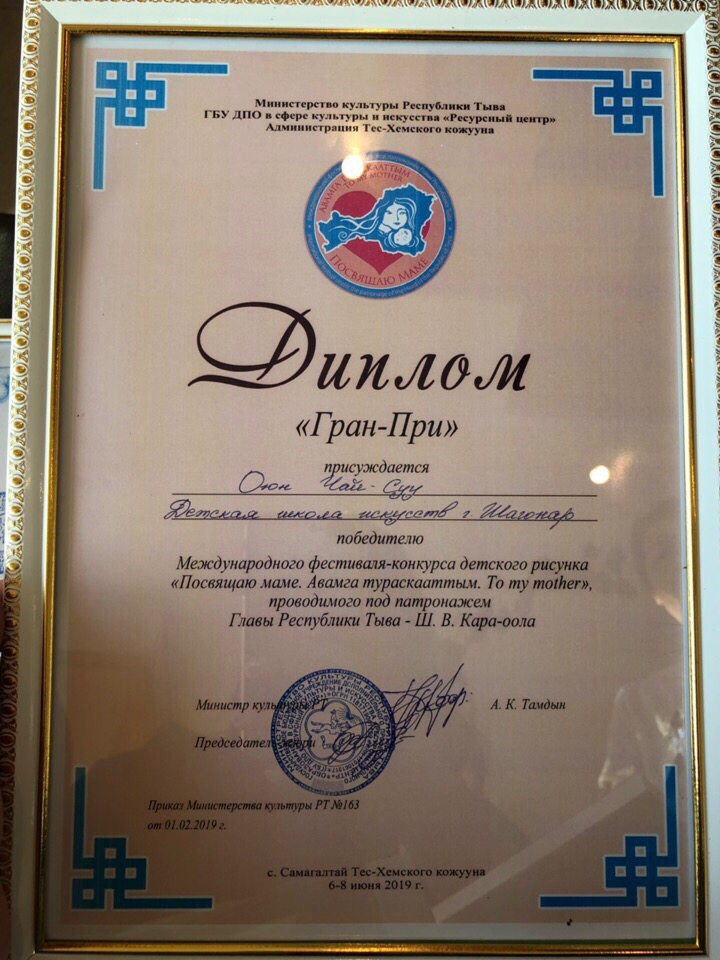 Фестиваль-конкурс проходил в два этапа: региональный, в котором два учащихся нашей школы отделения изобразительного искусства — Биче-оол Севил и Оюн Чайсуу, преподаватель Кыргыс Н.В., выиграли право участвовать в международном этапе фестиваля-конкурса, проходившего 7 июня 2019 года В Тес-Хемском кожууне с.Самагалтай . Юные художники 4 часа рисовали на тему «Посвящаю маме. Авамга тураскааттым.To my mother», в результате Биче-оол Севил-победительница в номинации «Приз зрительских симпатий», Оюн Чайсуу заслужила Гран-При Международного фестиваля-конкурса детского рисунка «Посвящаю маме. Авамга тураскаатым. To my mother” проводимого под патронажем Главы Республики Тыва -Ш.В.Кара-оол.