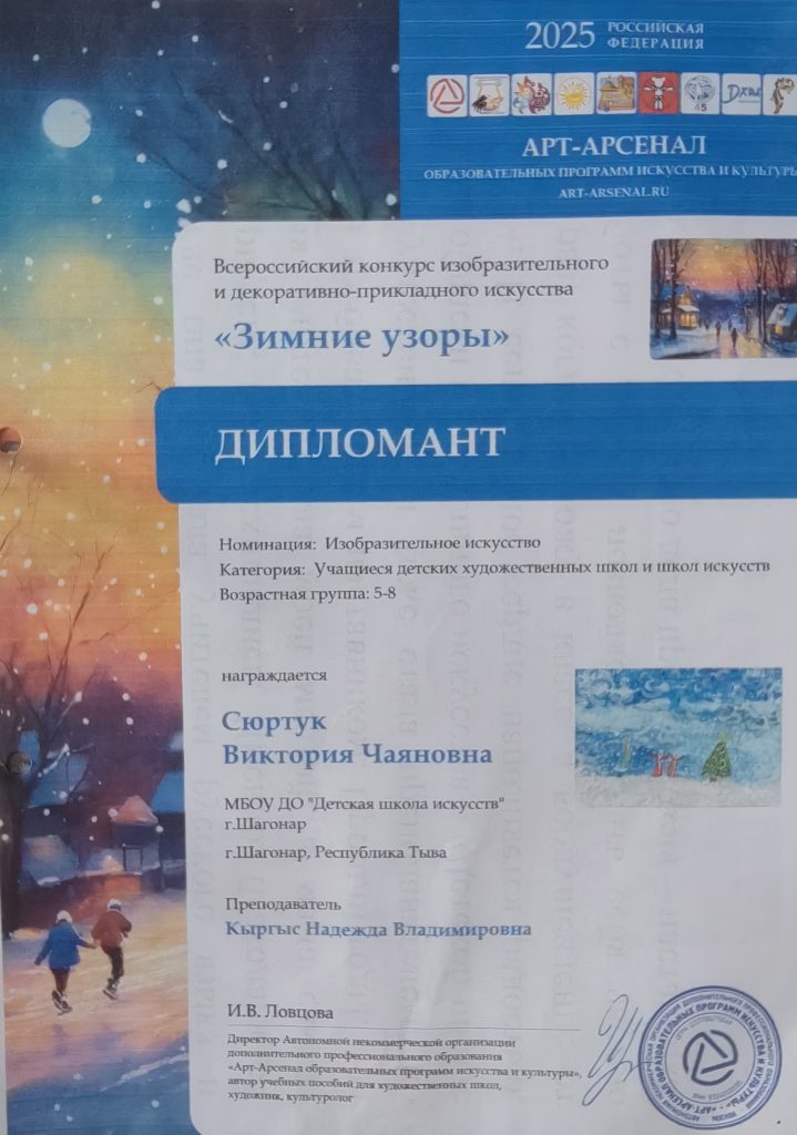 С «01» декабря по «15» января 2025 года учащиеся изобразительного искусства ДШИ г.Шагонар участвовали во Всероссийском конкурсе изорбразительного и декоративно-прикладного искусства «Новогодняя елка» и «Зимние узоры». Данные конкурсы направлены на выявление и поддержку одаренных детей в области изобразительного искусства, трансляцию творческих достижений молодых художников, лучшего творческого и педагогического опыта преподавателей. Конкурсы проходили среди учащихся детских школ искусств . Ребята запечатлели в своих рисунках и поделках зимнюю сказку, полную волшебства и тайны, поделились новогодним настроением.