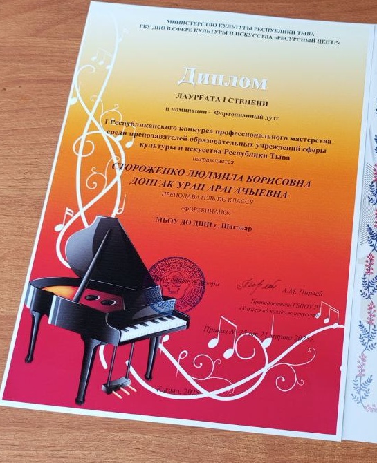 Преподаватели отделения фортепиано, высшей квалификационной категории Стороженко Людмила Борисовна и Донгак Уран Арагачыевна достойно выступив, стали лауреатами 1 степени в номинации «Фортепианный дуэт».