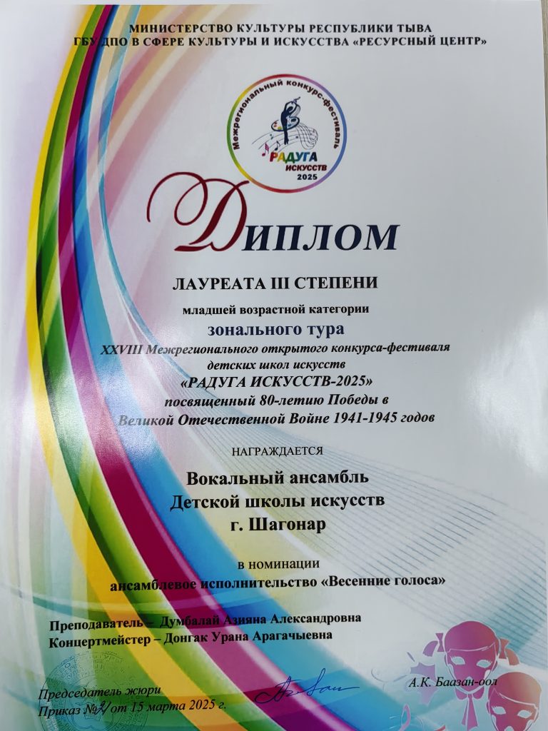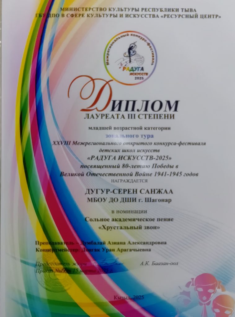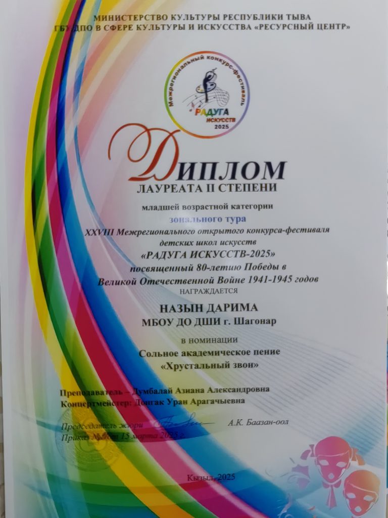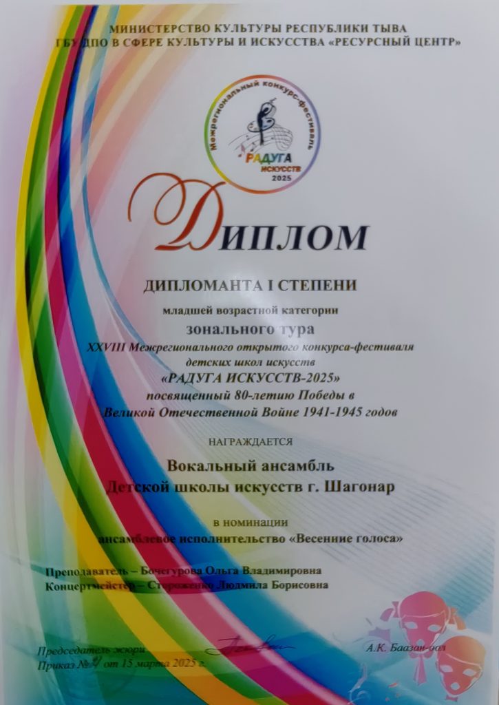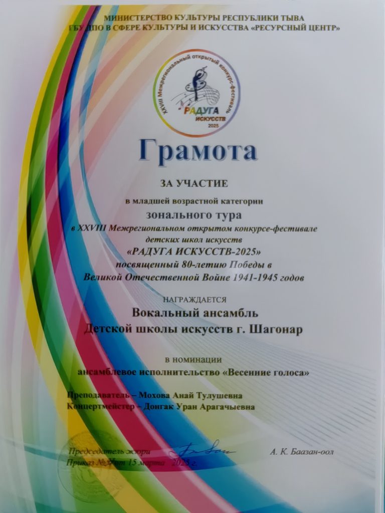 В зональном этапе XXVIII Межрегионального открытого конкурса исполнительских работ «Радуга искусств 2025» среди учащихся детских школ искусств Республики Тыва, посвященное 80-летию Победы в ВОВ по направлениям «Весенние голоса» и «Хрустальный звон» наши учащиеся прошли отборочный тур со следующими результатами: