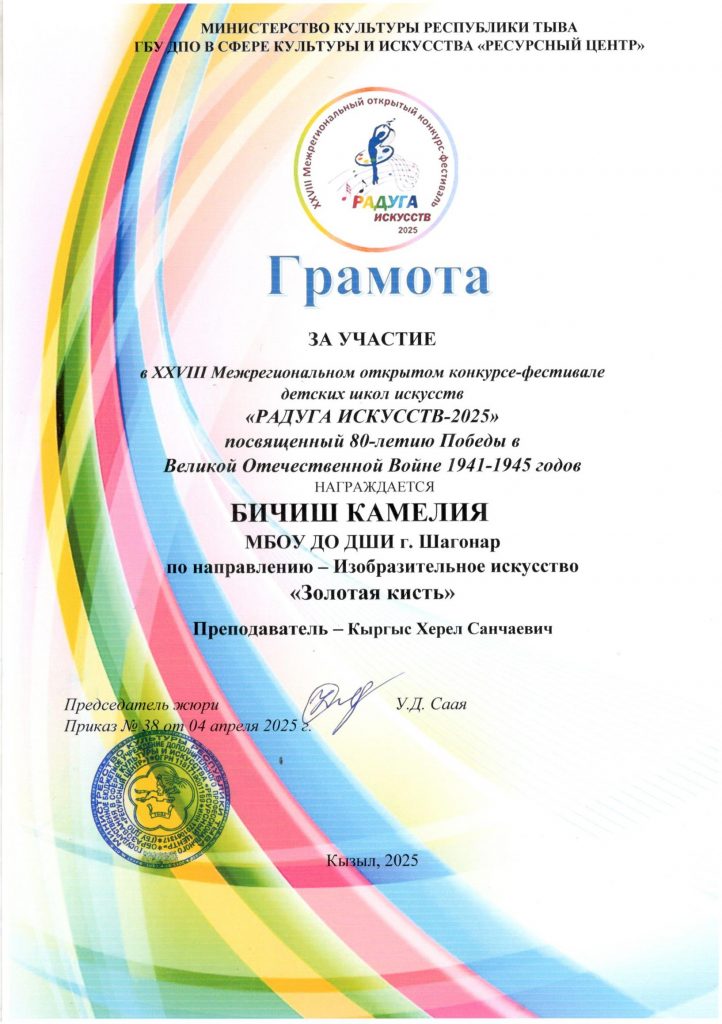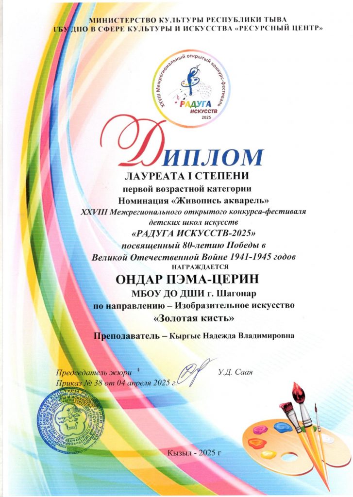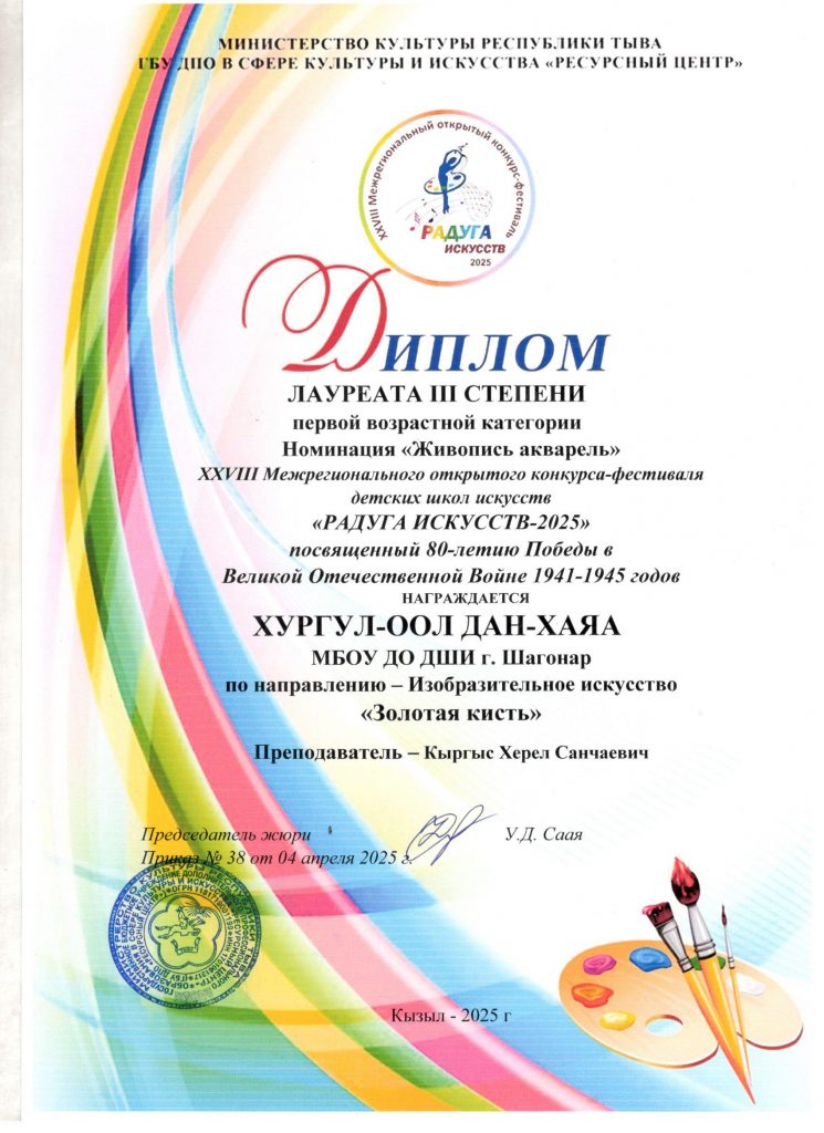 «04» апреля 2025 года прошел XXVIII Межрегиональный открытый конкурс «Радуга искусств 2025» по направлению изобразительное искусство «Золотая кисть». Цель конкурса -выявление и поддержка художественно-одаренных детей. Выполнив Конкурсную работу в течение 5 часов, наши учащиеся показали следующие результаты: