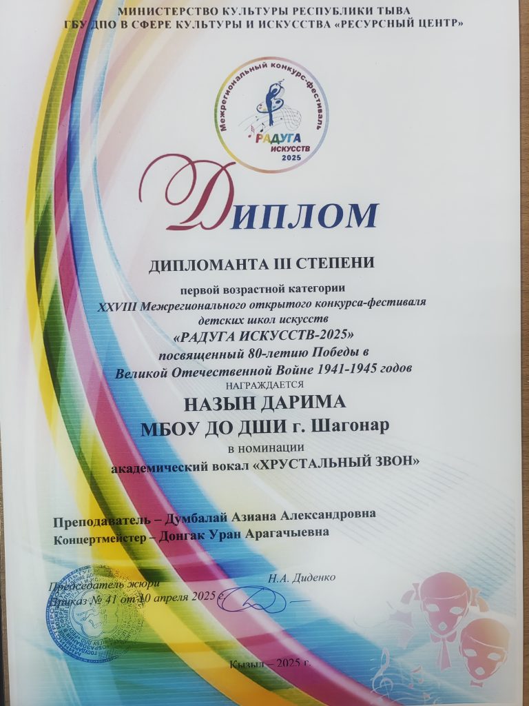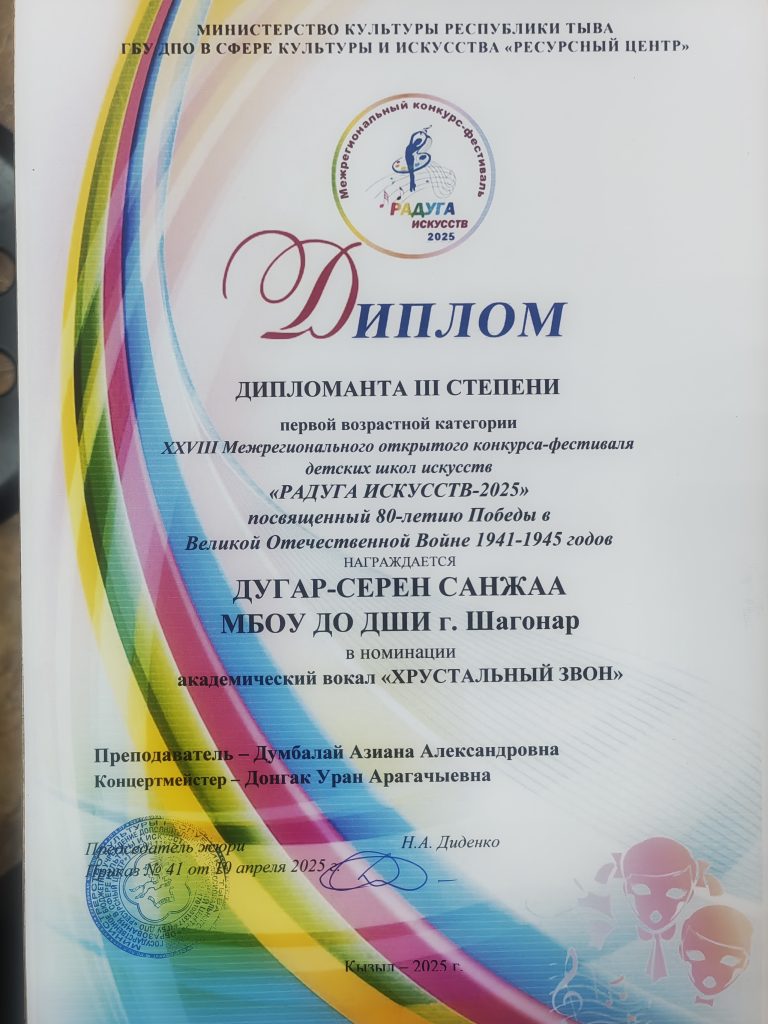 «10» апреля 2025 года в XXVIII Межрегиональном открытом конкурс-фестивале «Радуга искусств 2025» в номинации академический вокал «Хрустальный звон» наши звездочки Назын Дарима и Дугур-Серен Санжаа стали дипломантами 3 степени. Дарима и Санжаа учащиеся 1 класса и это их первое выступление в межрегиональном конкурсе.