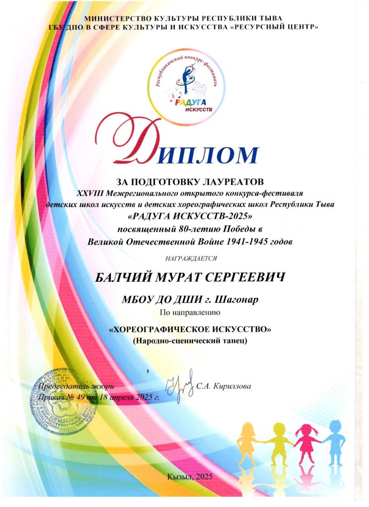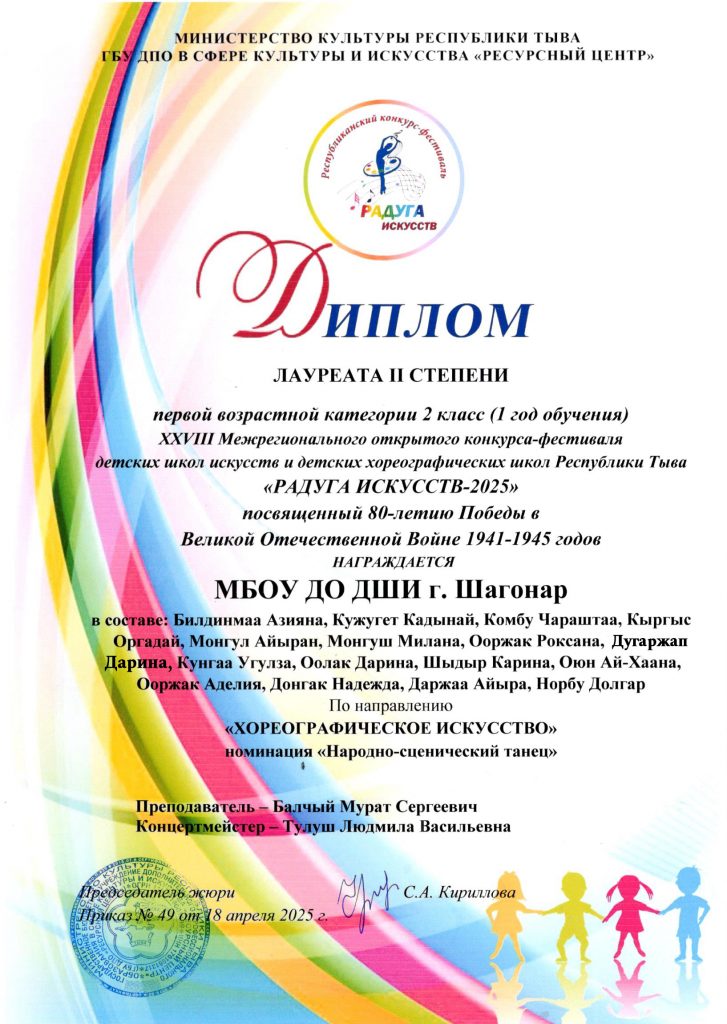«18» апреля 2025 года проходил очный этап XXVII Межрегионального открытого конкурса -фестиваля среди детских школ искусств и детских хореографических школ Республики Тыва «Радуга искусств 2025» по направлению «Хореографическое искусство». Хореографический коллектив ДШИ г. Шагонар пройдя зональный этап, приняли участие в очном этапе и стали лауреатами 2 степени 🏆 в первой возрастной категории (1 год обучения), в номинации «Народно-сценический танец», преподаватель высшей квалификационной категории Балчый Мурат Сергеевич, концертмейстер первой квалификационной категории Тулуш Людмила Васильевна.