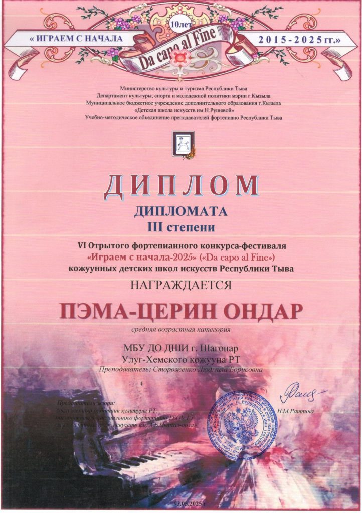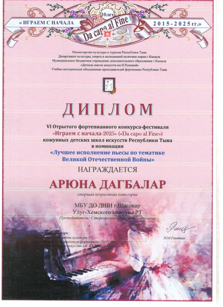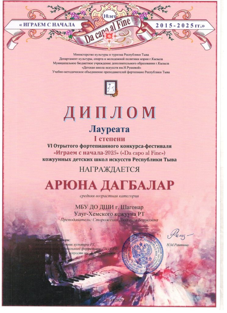 «03» мая 2025 года прошел VI Открытый фортепианный конкурс -фестиваль «Играем с начала 2025» кожунных детских школ искусств Республики Тыва, в котором наши учащиеся добились следующих результатов: