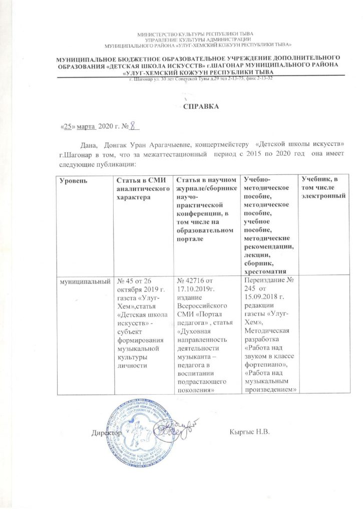 - Статья «Детская школа искусств» — субъект формирования музыкальной культуры личности» в газета «Улуг-Хем» № 45 от 26 октября 2019 г.